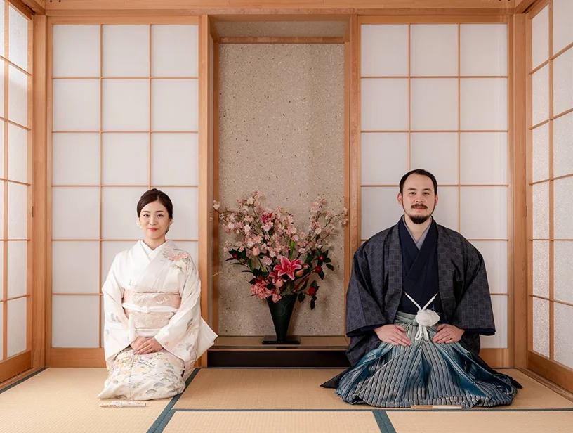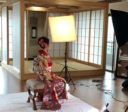和装での写真撮影にも対応しております。和室利用・背景等ご相談ください。(カメラマン同伴での撮影スタジオとしての利用やウェディングドレスなど洋装での撮影も可能です)